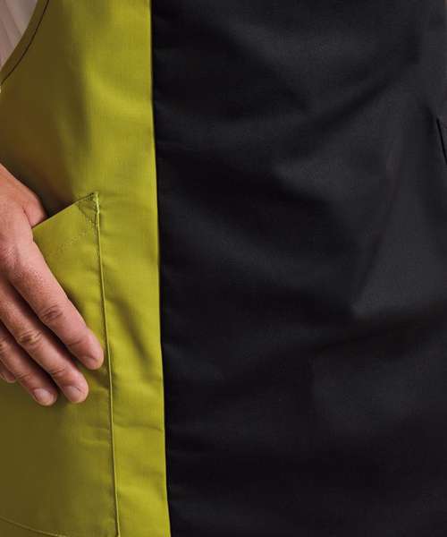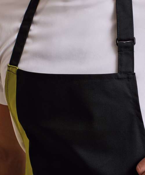 A classic full bib apron with a contrast coloured panel appearing along the length of the right hand side which can be an excellent branding solution. The colours used on this apron are part of the 'Colours Collection' from Premier. Featuring two slanted side pockets and useful adjustable buckle on the neckband.