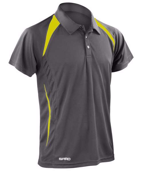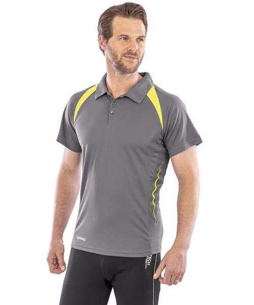 Performance lightweight polo. Breathable. Printed design feature. Soft comfort fit COOL-DRY® fabric. Quick drying. 3 button neck closing. Dropped hem. Keeps the skin cool and comfortable. Ideal layer garment, good warmth factor when wore as a layer. Extremely lightweight. Highlighted Spiro logo on right botton hem. Decoration Guidelines: Decorating methods: Embroidery & Transfer print. Decorators access point: Open.